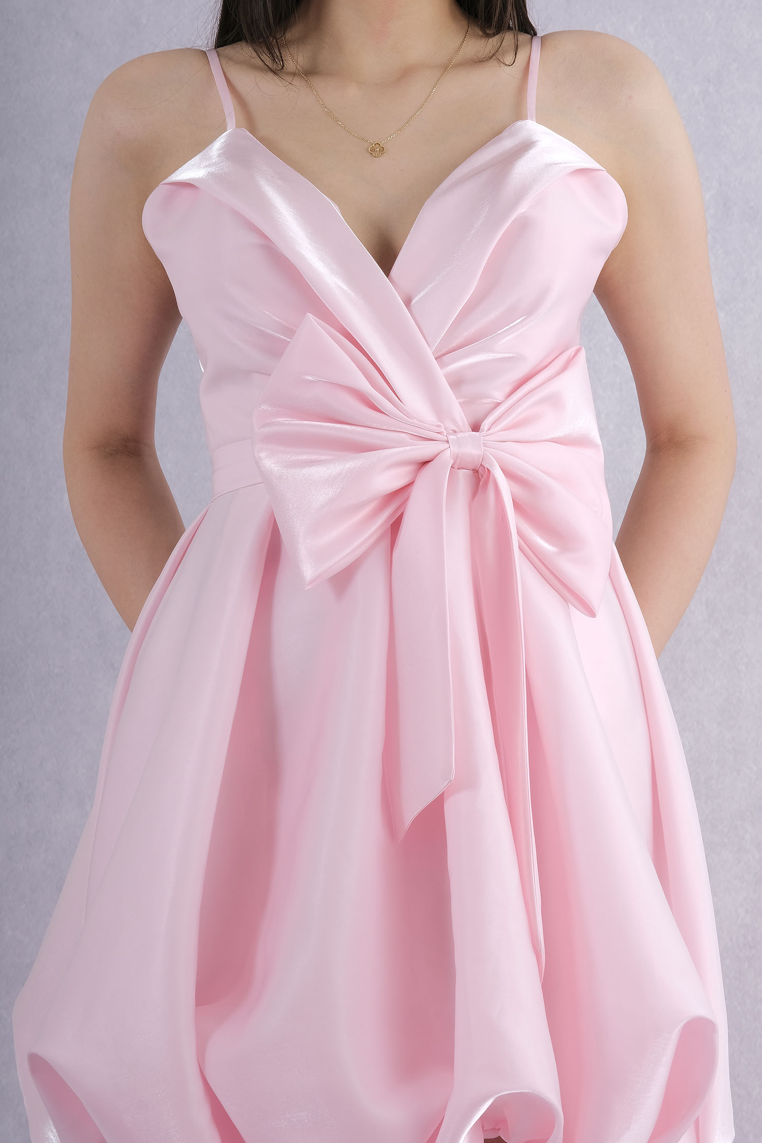 İnce askılı tasarımı, göğüs kısmındaki drape detayı ve beldeki büyük fiyonk ile öne çıkan, balon form eteğiyle hareketli ve şık bir görünüm sunan mini abiye elbise. Davet, Parti ve özel organizasyonlarda dikkat çekici bir stil oluşturur.
