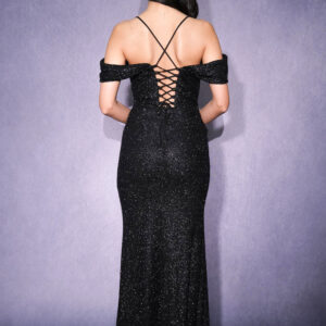 İnce askılı ve omuzdan düşen kol detayıyla zarif bir görünüm sunan, simli dokusu ve yırtmaç detayıyla dikkat çeken, vücuda oturan kesimiyle feminen bir siluet oluşturan uzun abiye elbise. Nişan, Davet ve özel organizasyonlarda şık bir stil sunar.