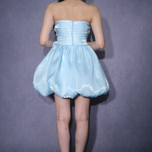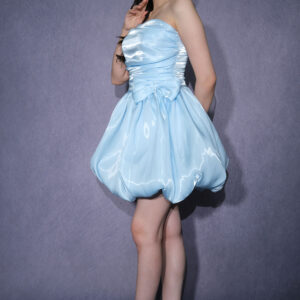 Straplez kesimi, üst kısmındaki drapeli formu ve belde yer alan fiyonk detayıyla dikkat çeken, parlak kumaşı ve balon etek kesimiyle enerjik ve şık bir görünüm sunan mini abiye elbise. Davet, Parti ve özel organizasyonlarda göz alıcı bir stil oluşturur.