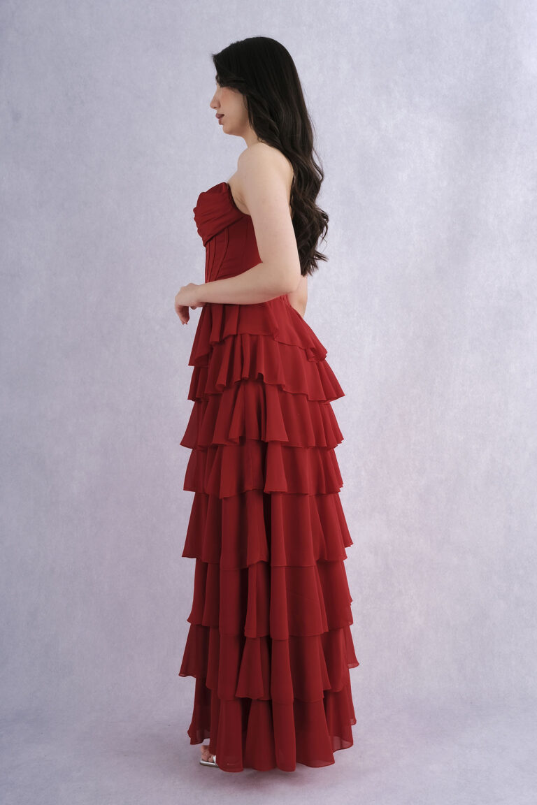 Straplez kesimi ve vücuda zarif şekilde oturan formu ile öne çıkan, ön kısmındaki akıcı drape detayları ve yüksek yırtmaç kesimiyle feminen ve sofistike bir görünüm sunan uzun abiye elbise. Minimal şıklığıyla Nişan, Mezuniyet ve özel gece davetlerinde zarif bir stil oluşturur.